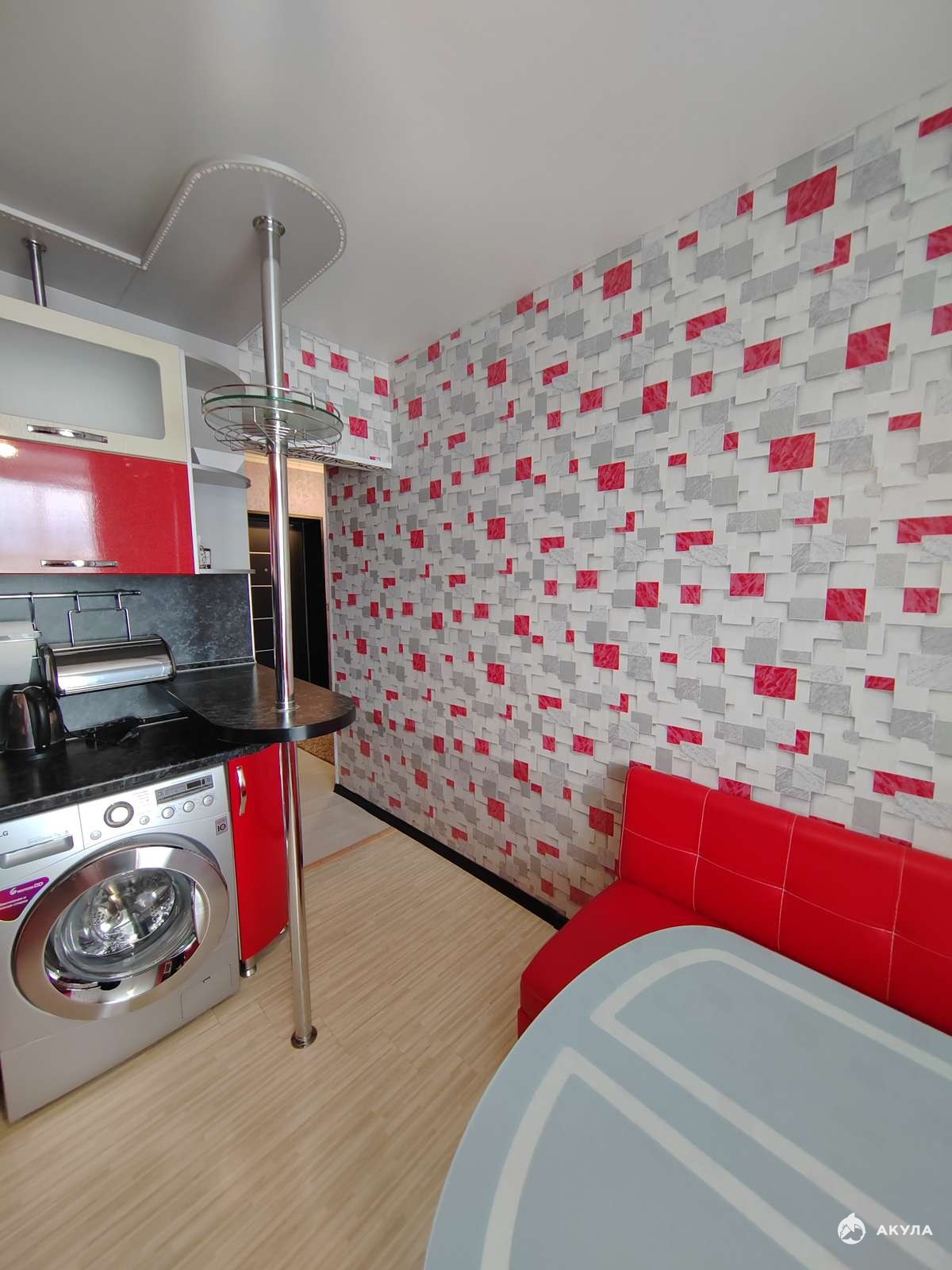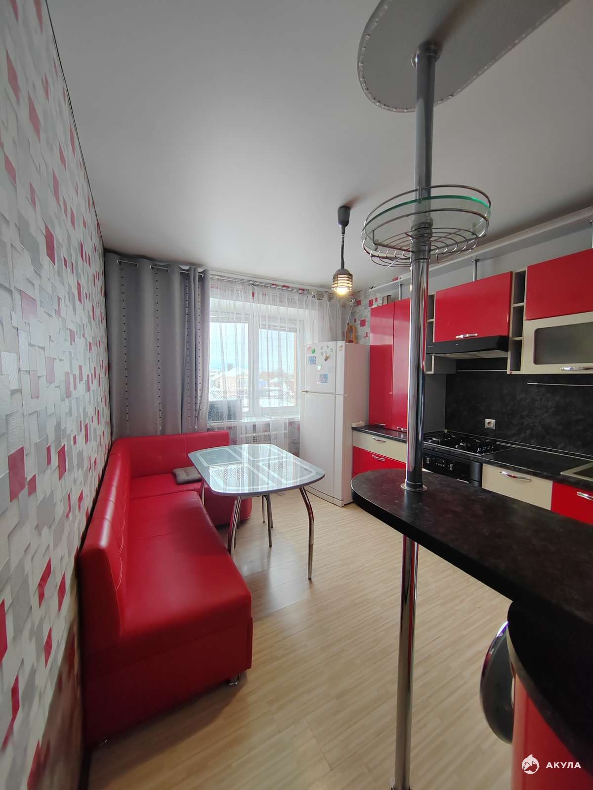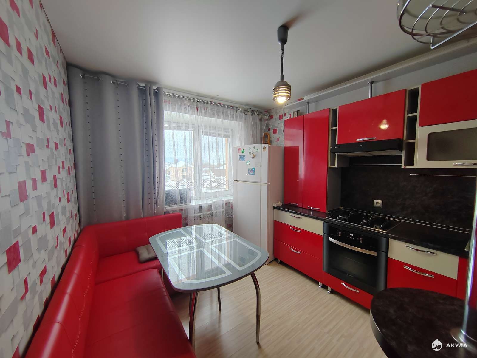 Новым собственникам остаётся и входит в стоимость современный кухонный гарнитур с встроенной бытовой техникой : варочная панель, вытяжка, духовой шкаф. Так же на кухне оставляют кухонный стол и угловой диванчик (превращаеться в полноценное спальное место для двоих). В прихожей и в большой комнате остаются многофункциональные шкафы-купе.