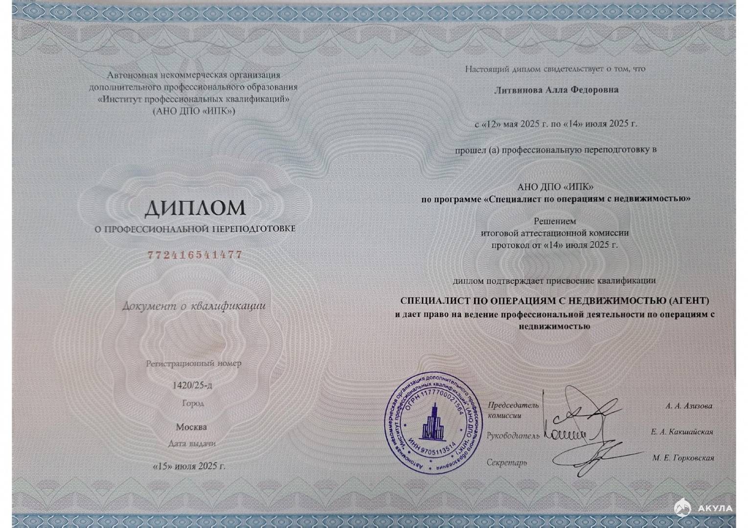 С вами будет работать Алла Литвинова - ведущий специалист АН Квадрат.