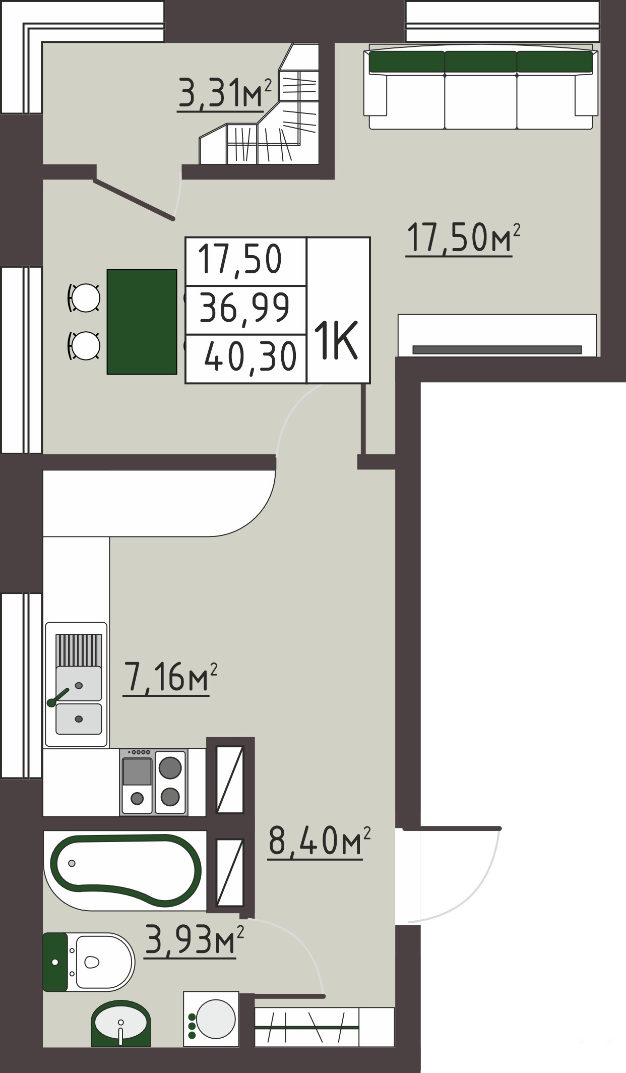 Площадь: 41 кв.м., однокомнатная.