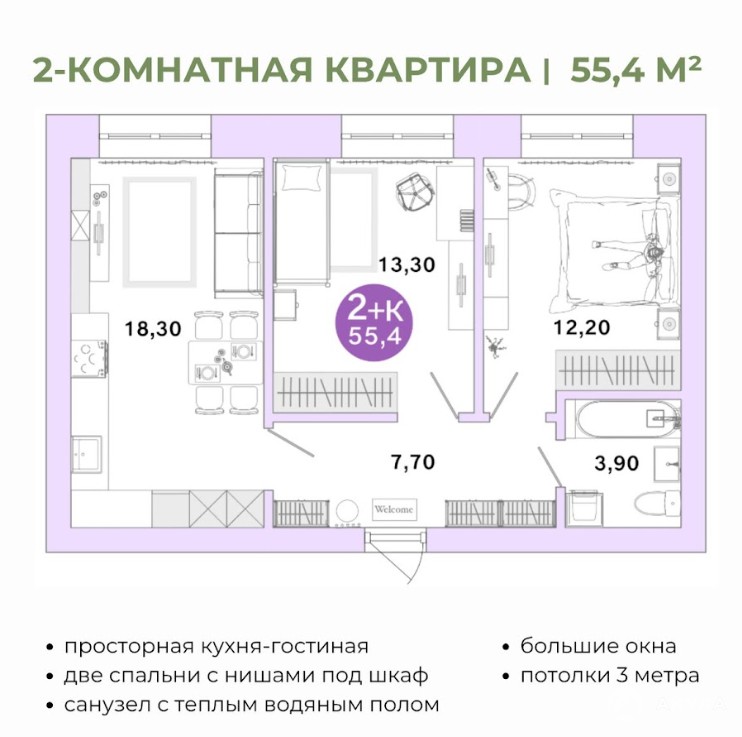 ✅ В продаже Двухкомнатная квартира, S – 67.5 кв.м есть выбор этажей и планировочных решений.