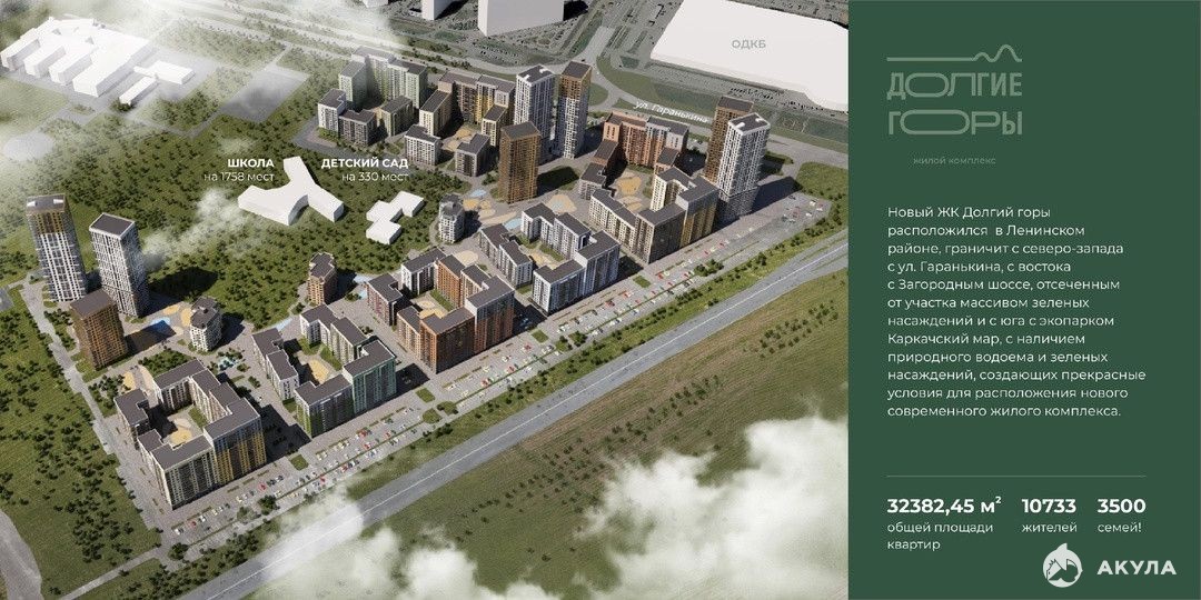 �� ЖК «Долгие горы» -это 30-ть домов переменной этажностью. Комплекс представляет очень интересную, необычную для Оренбурга архитектурную концепцию проекта, разработанную шведским и Санкт-Петербургским архитектурными бюро.