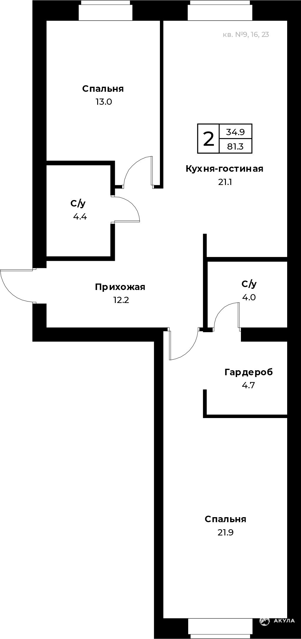 - 34.9 м²
