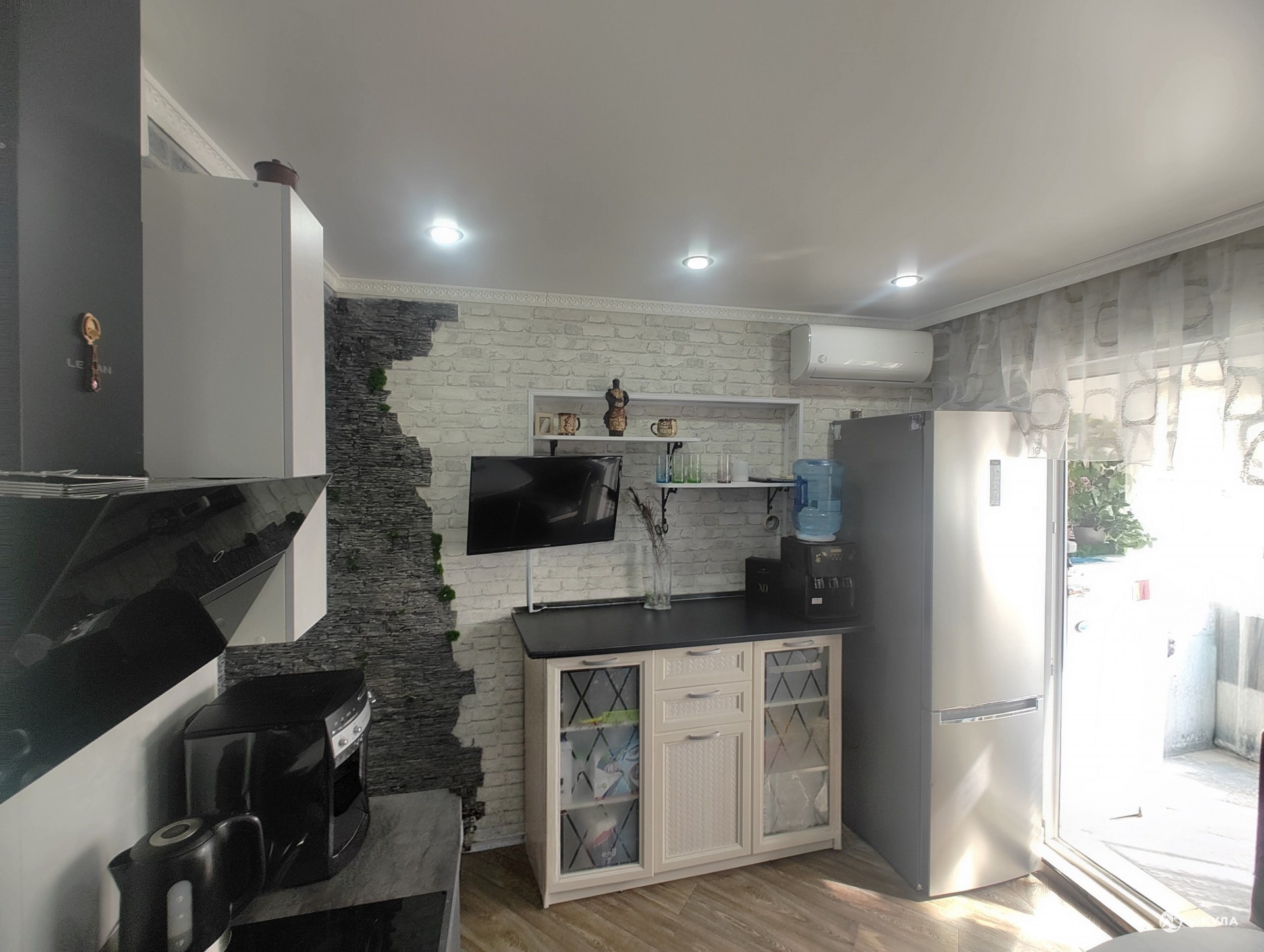 Ремонт: качественный — напольное покрытие (керамогранит), стены (обои горячего тиснения), санузел с качественной сантехникой, кухонный гарнитур с техникой (варочная панель, вытяжка), входная дверь с терморазрывом.