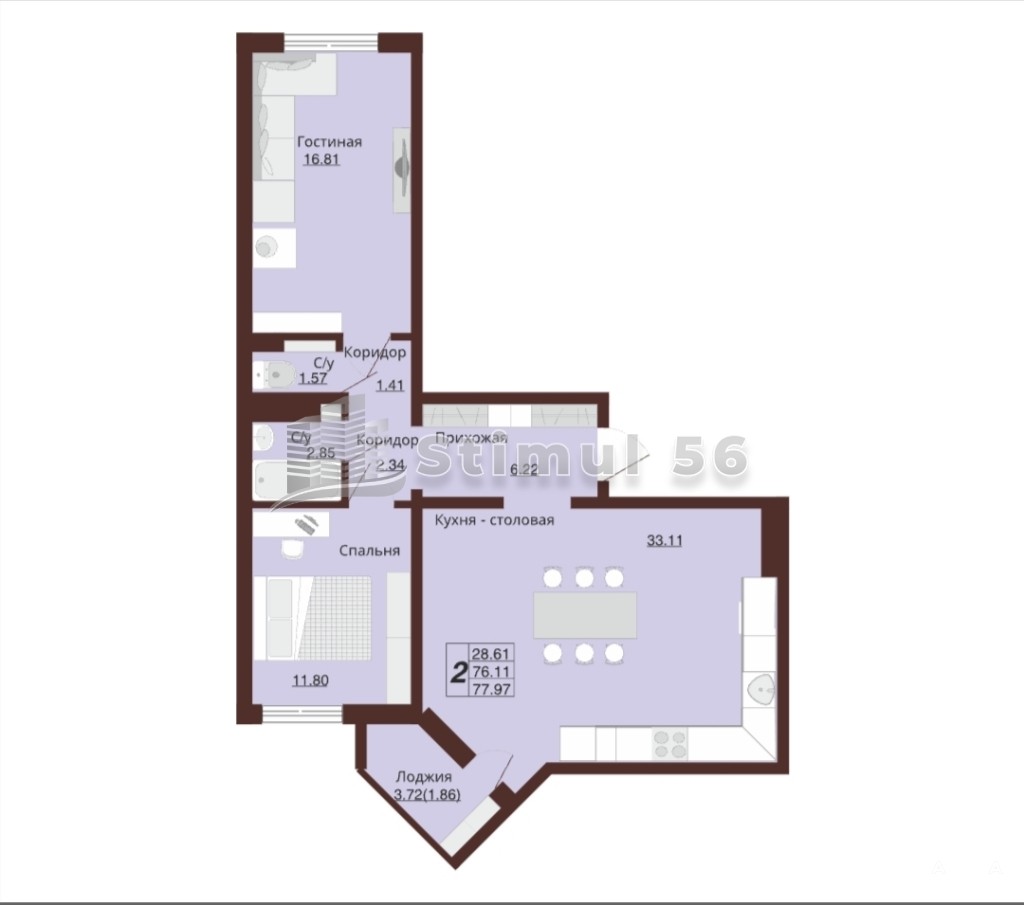 Пpодается двухкомнатная квaртиpа 77, 97 квадратных метров, 33, 11 квм кухня-гостиная!