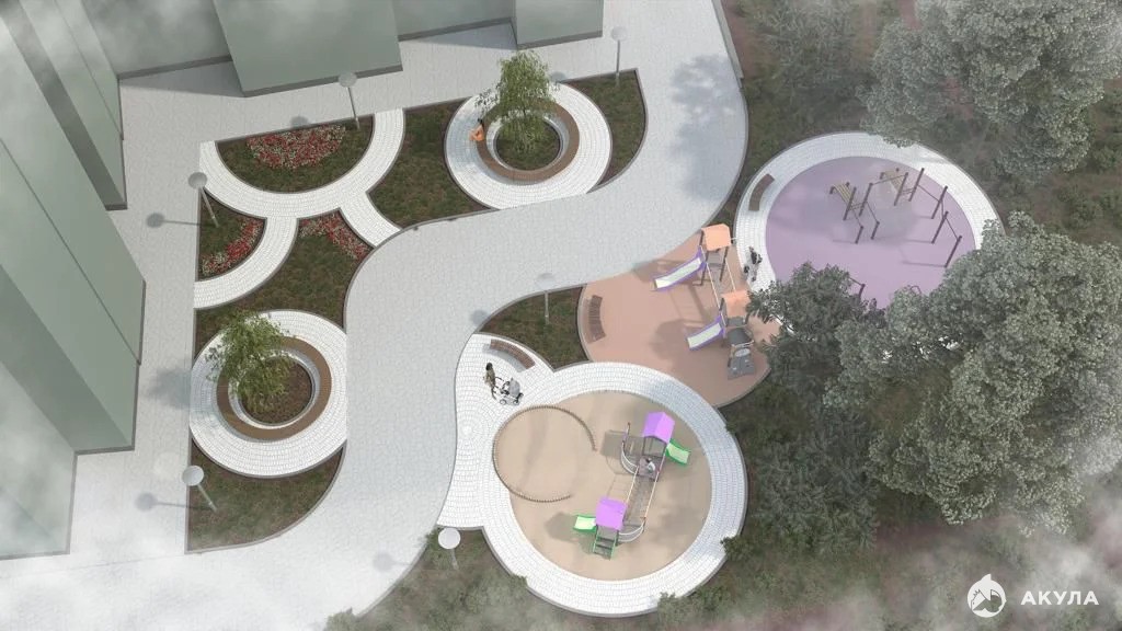 Во дворе дома закрытый двор с игровой площадкой для детей, разделенной по возрастам с уголками и площадками, оборудованными для различных активностей. Архитектурные формы и места общего пользования разработаны с уважением к природе.