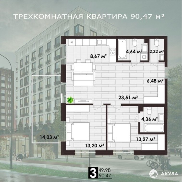 ✅ В продаже трехкомнатная квартира, S - 91 кв.м. Ставка 14%