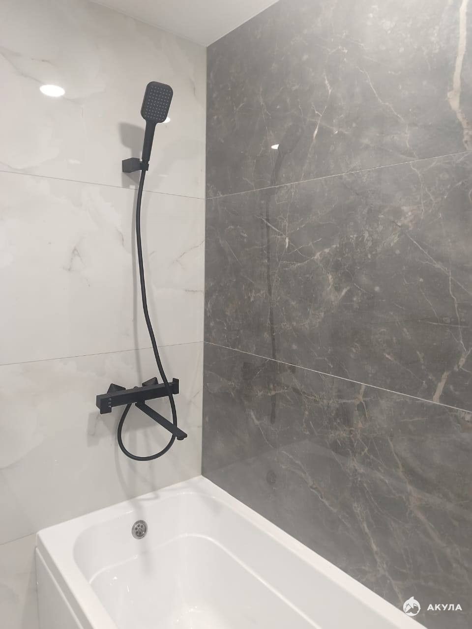 · Натяжные белые матовые потолки с точечными светильниками Балкон: Короед и плитка на полу