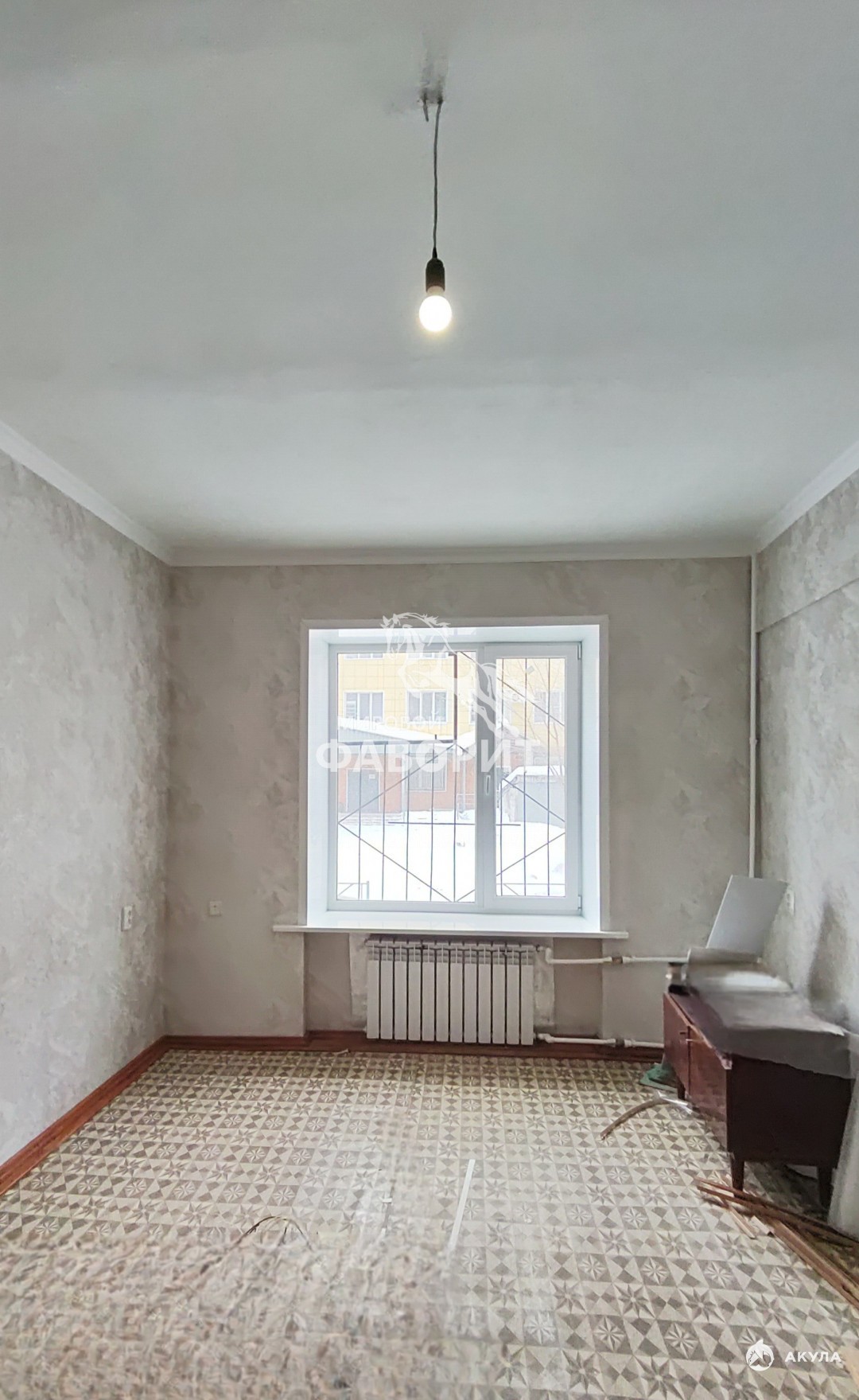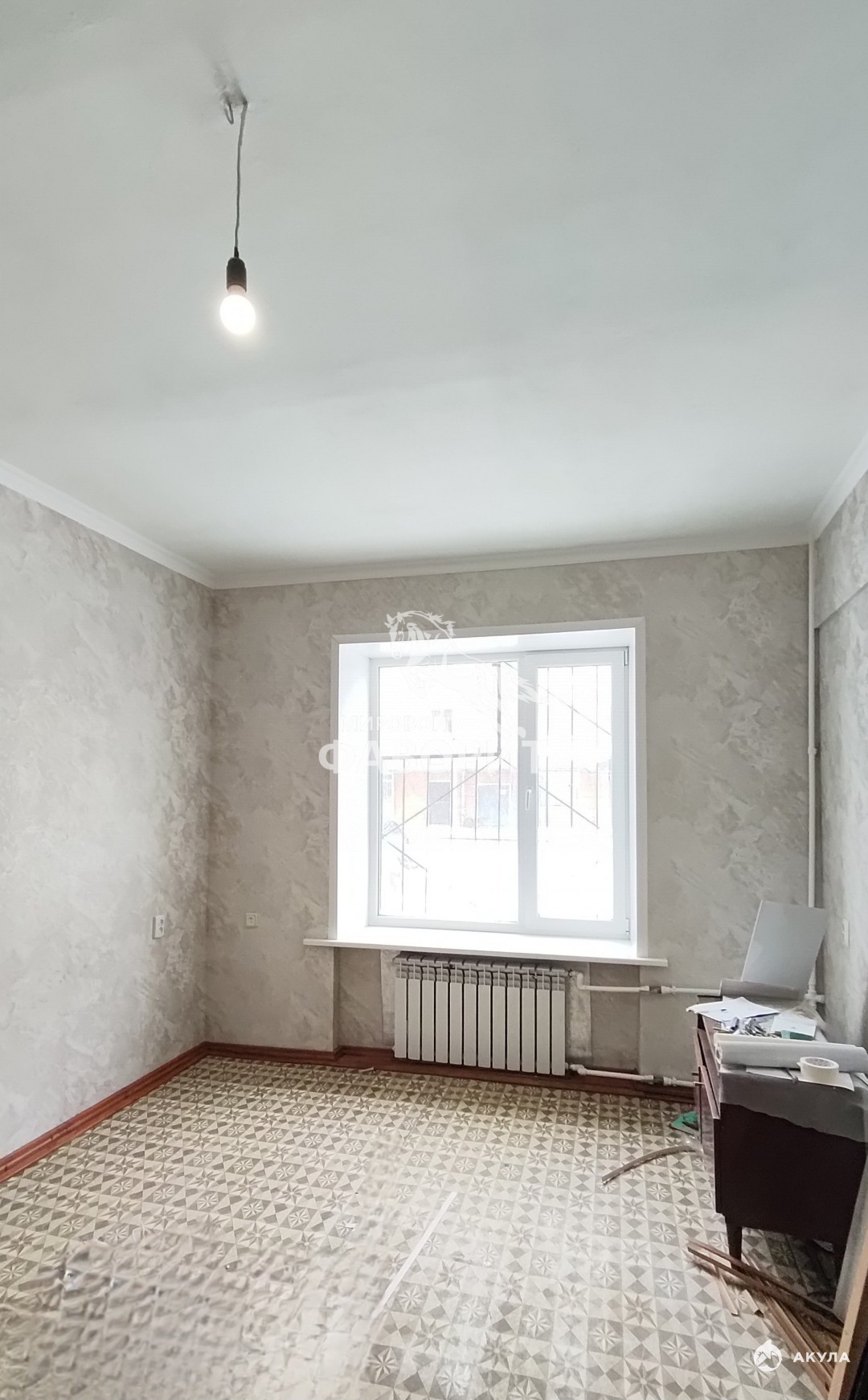 Квартира с косметическим ремонтом: выровнены стены, оклеяны обоями; ровные высокие потолки ( 3 м.); пластиковые окна высокого качества, на окнах решетки;новые радиаторы отопления;пол выровнен, застелен линолеумом.
