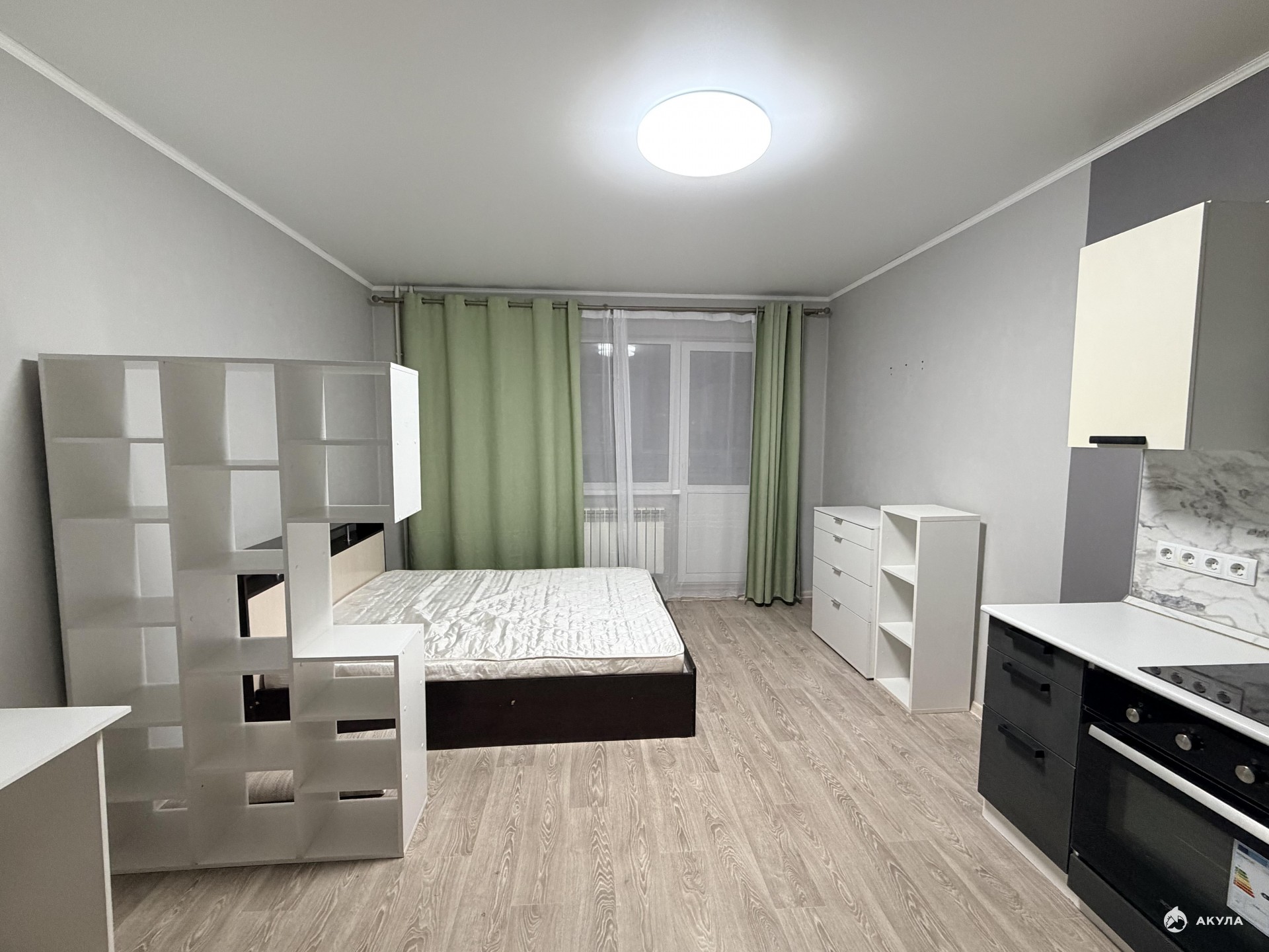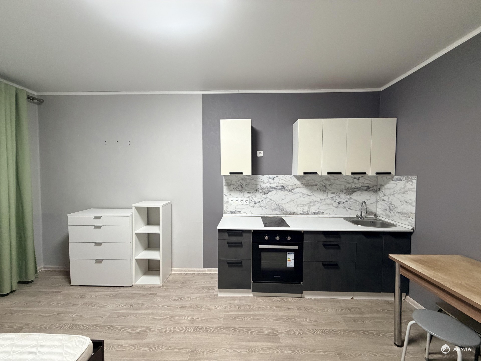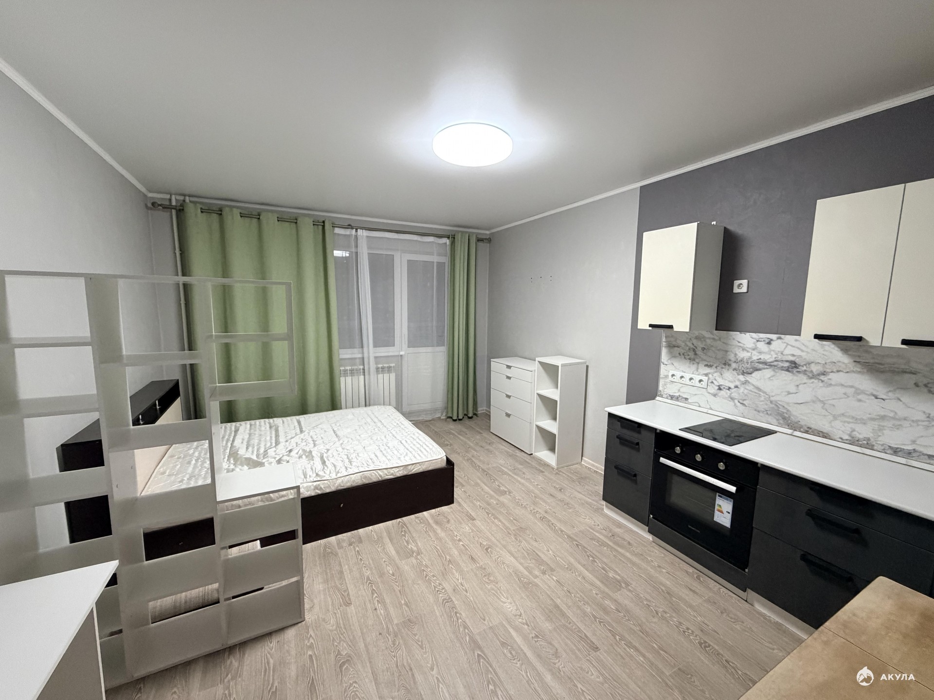 Площадь комнаты позволяет сделать зонирование - разделить на кухонную и спальную зоны.