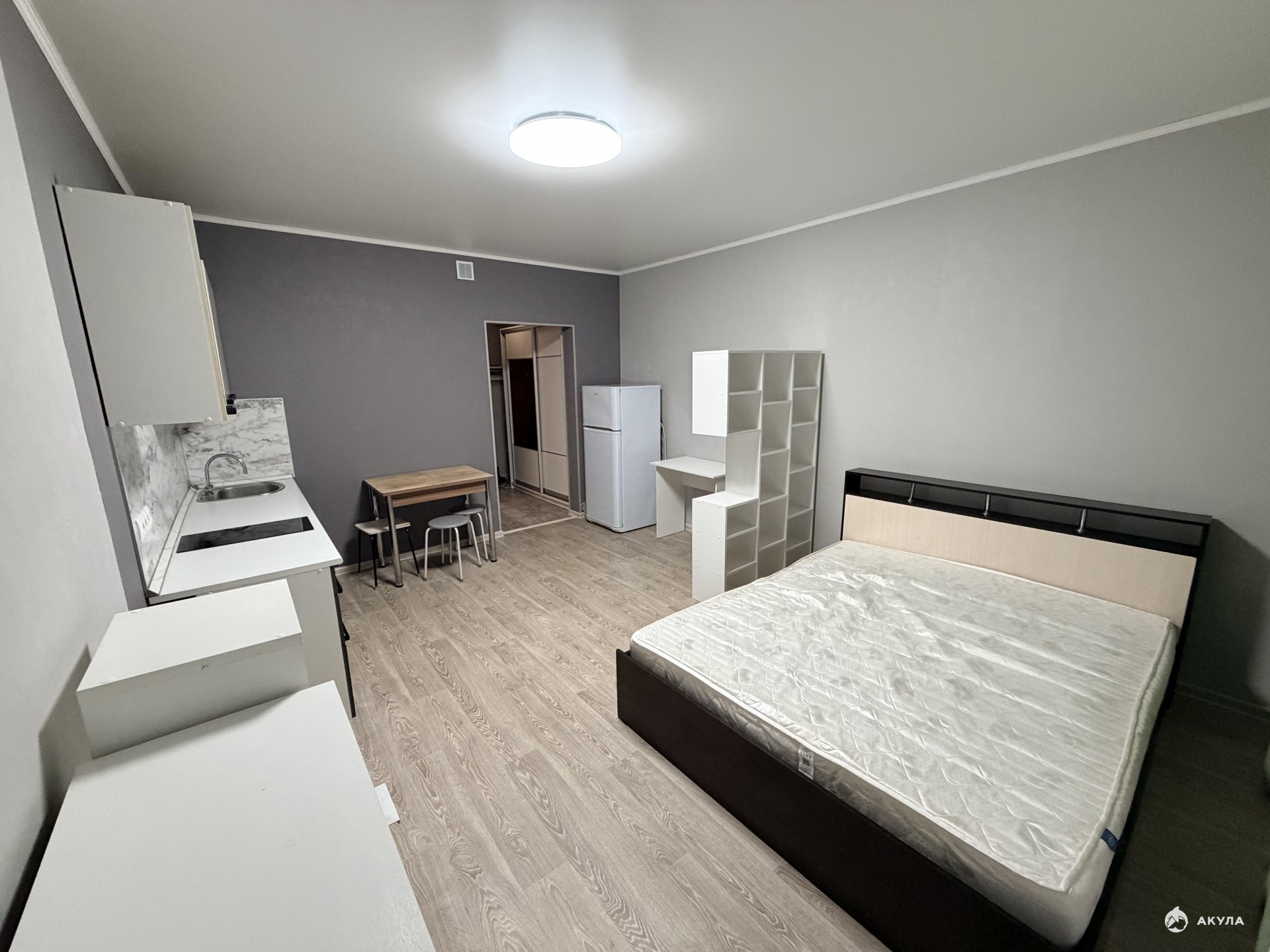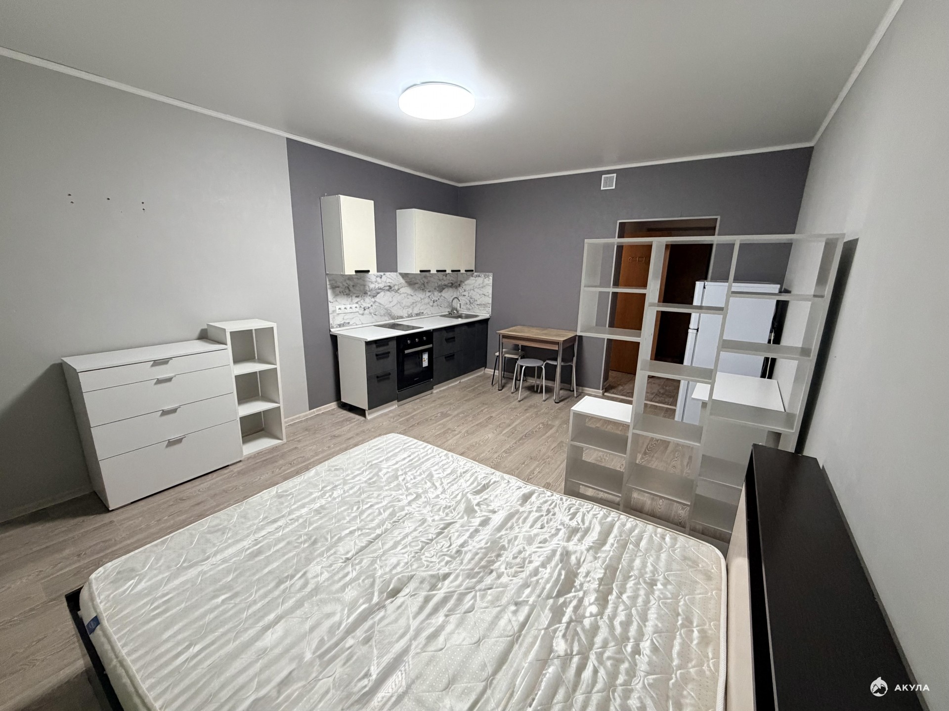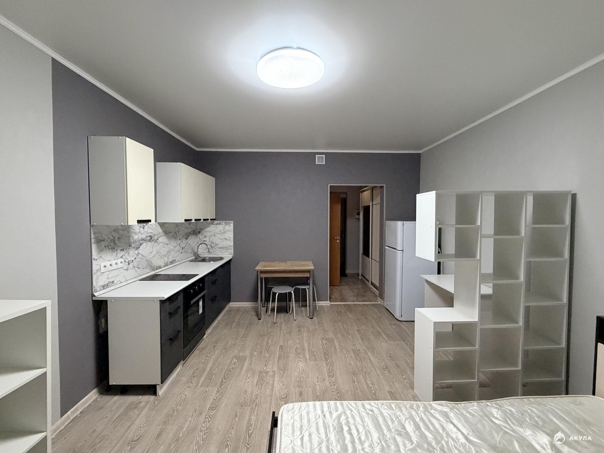 Площадь комнаты позволяет сделать зонирование - разделить на кухонную и спальную зоны.